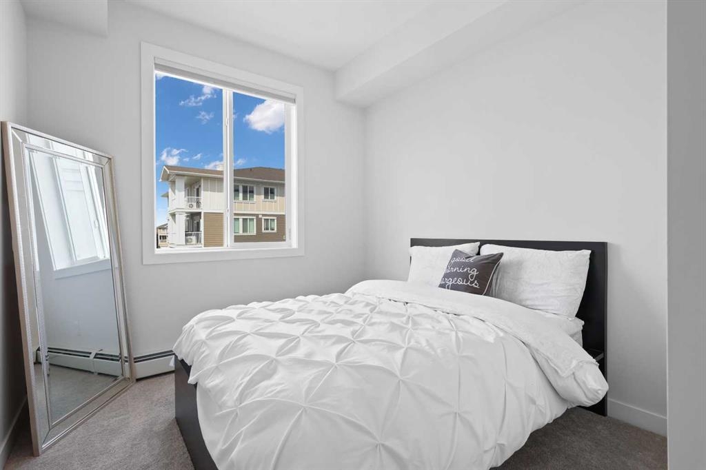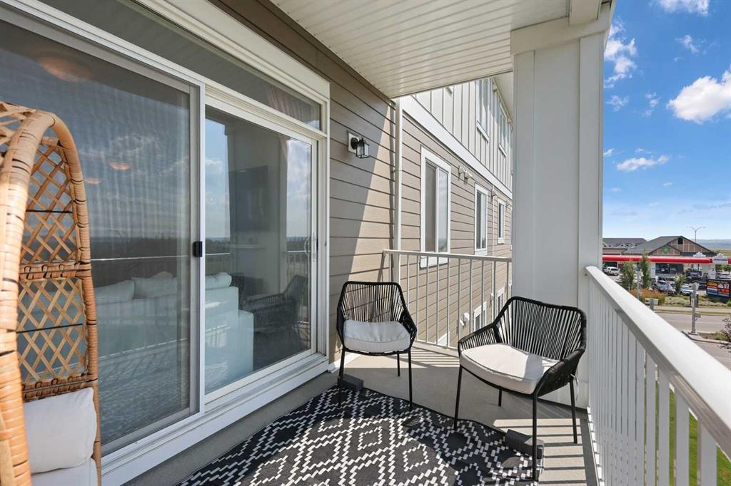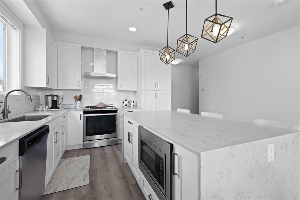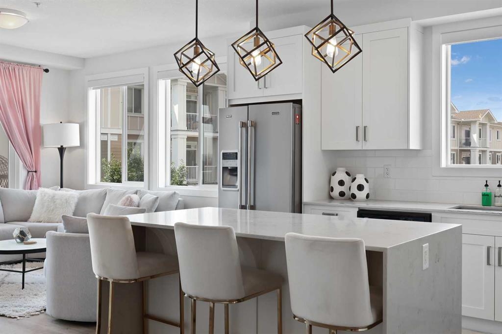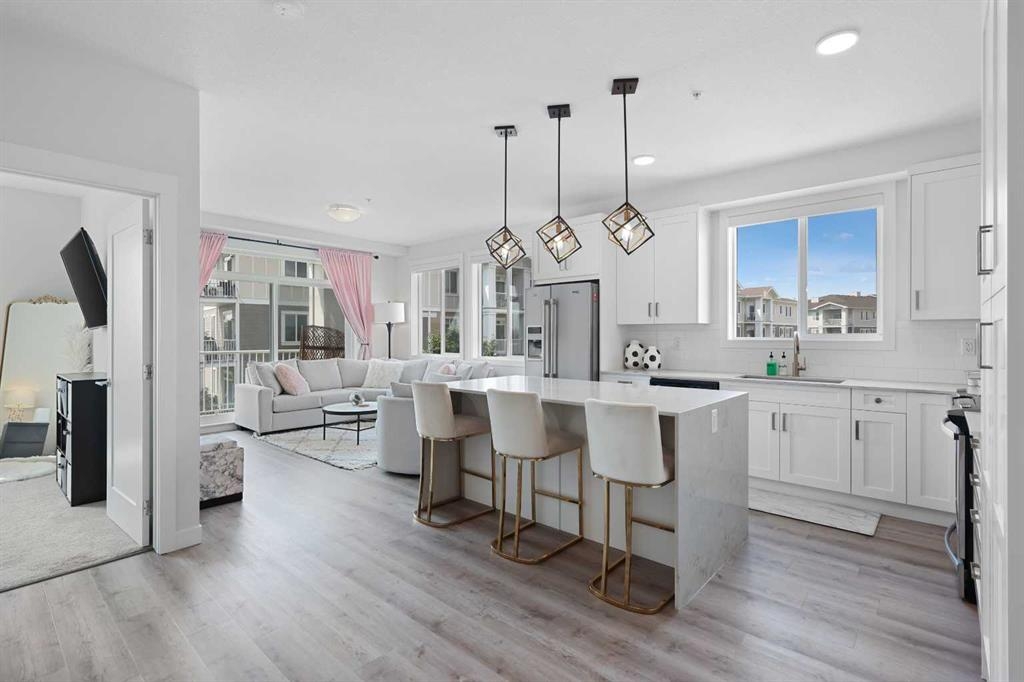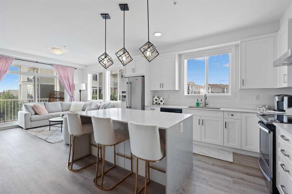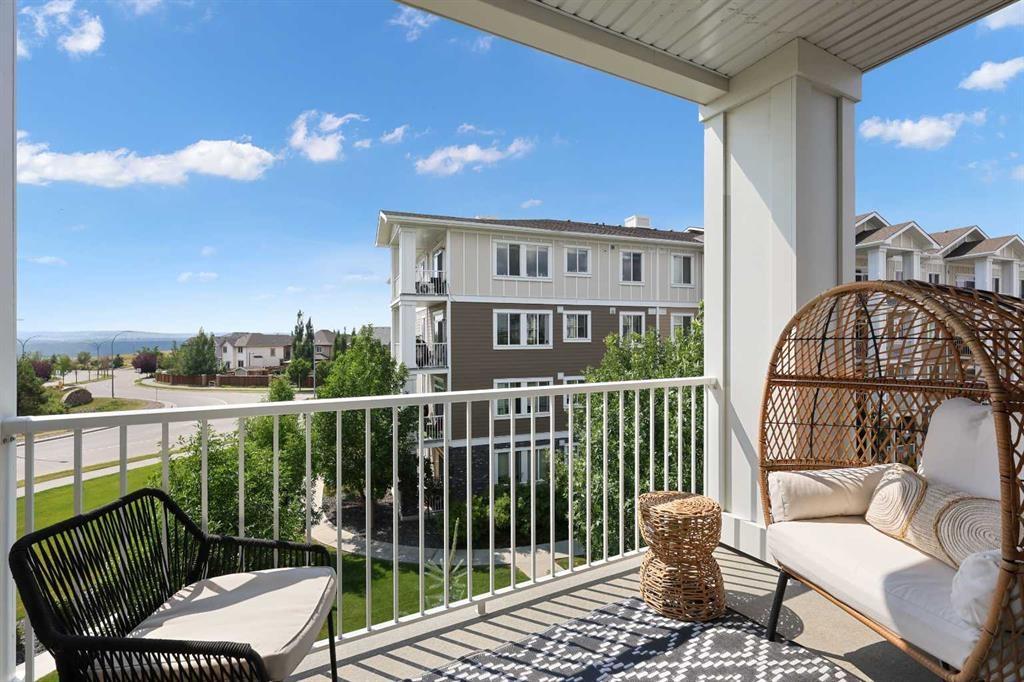Welcome to Cranston Ridge, where modern living meets convenience. This stunning third floor corner unit offers 2 bedrooms, 2 bathrooms and a contemporary design with many thoughtful upgrades! The kitchen boasts high-end stainless steel appliances, quartz countertops, extra large island with a stunning waterfall edge, beautiful cabinetry, a pantry, an impressive upgraded hoodfan and new light fixtures over the island. The spacious primary bedroom with blackout blinds, includes a large walk-through closet leading to a beautifully designed 4 piece ensuite with a fully tiled shower, double-sink vanity and additional storage. The second bedroom is bright and located next to the main bathroom. This room is perfectly suited for guests or for use as a home office. The open floor plan flows seamlessly into a generous living area, ideal for entertaining or relaxing in front of the TV (electric fireplace not included). Step outside to the sunny balcony, complete with a natural gas hookup for your BBQ. The corner location offers an abundance of windows and lots of natural light. Additional conveniences include a high-efficiency washer and dryer, a titled heated underground parking stall, and a storage locker conveniently located near your parking space. Cranston Ridge offers a well-maintained and desirable complex, located just minutes from shopping, hiking trails, playgrounds and schools. Enjoy easy access to the Bow River Valley and Fish Creek Park, with excellent connections to Seton, the South Calgary Health Campus, and major routes like Stoney and Deerfoot Trails. The community HOA fee includes access to the exclusive Century Hall, offering amenities such as a gymnasium, multipurpose rooms, an outdoor rink with a Zamboni, a pleasure pond, toboggan hill, splash park, playground, pickleball/tennis courts, and basketball. This apartment is perfect for anyone seeking an elegant, low-maintenance lifestyle while staying close to nature, playgrounds, and shopping, with quick access to Deerfoot Trail, Stoney Trail, Seton Lifestyle District, and the South Health Campus Hospital. This home is immaculate and ready for you to simply move in!