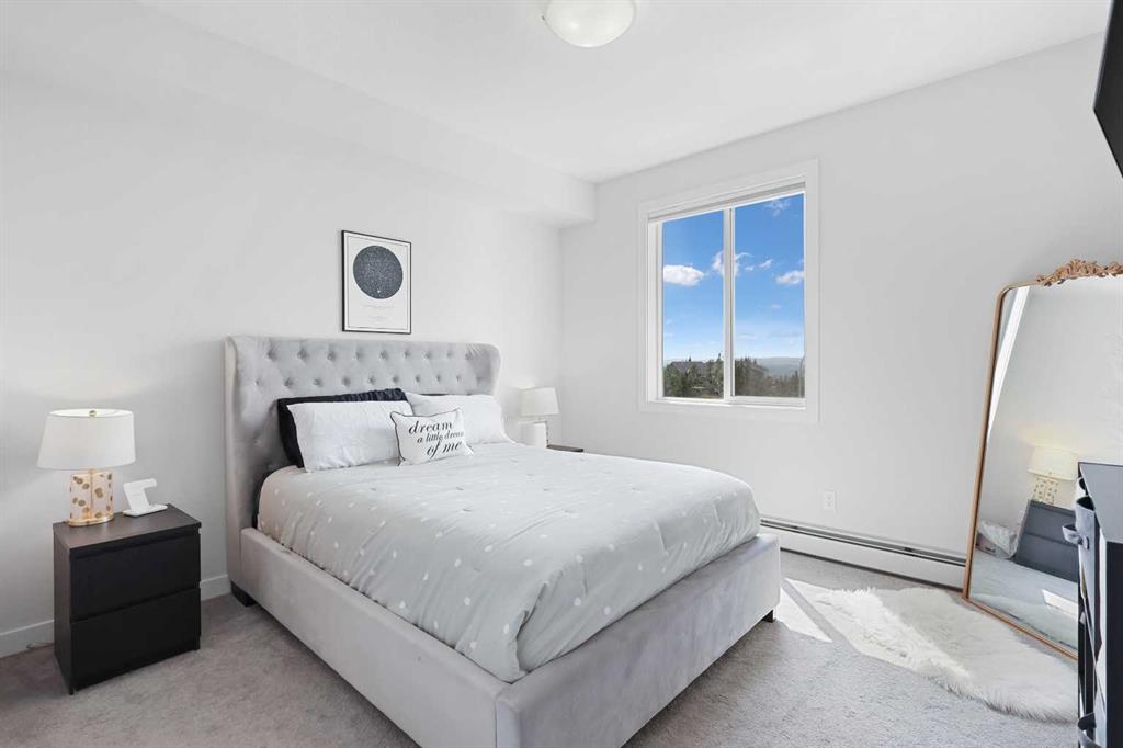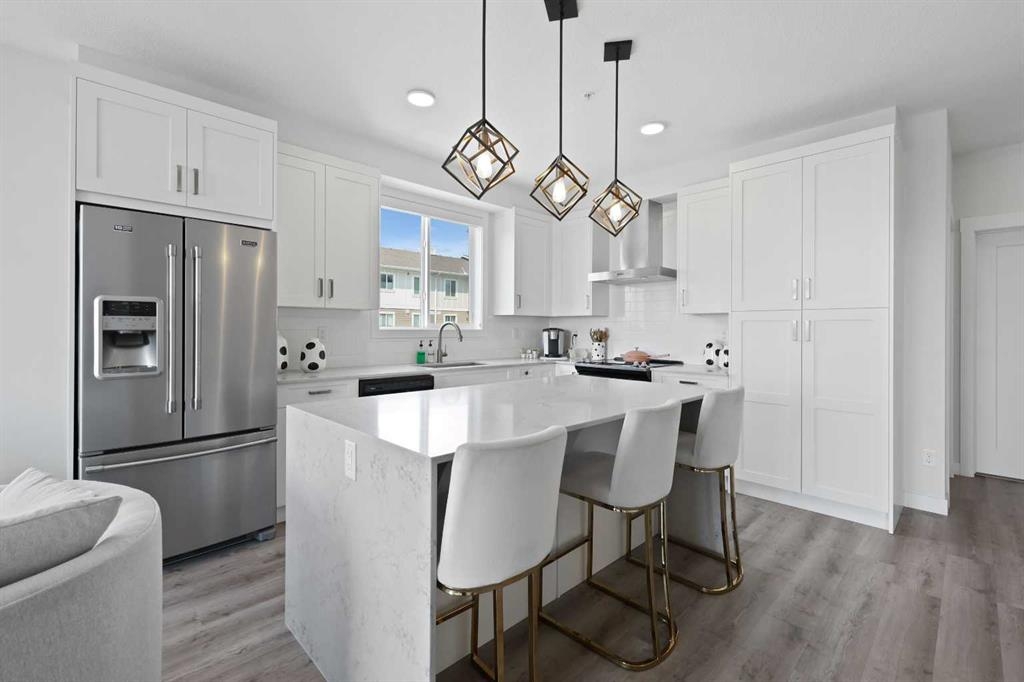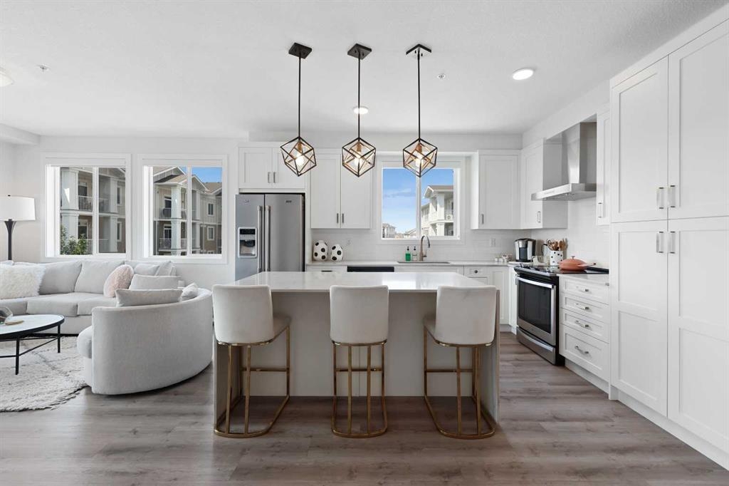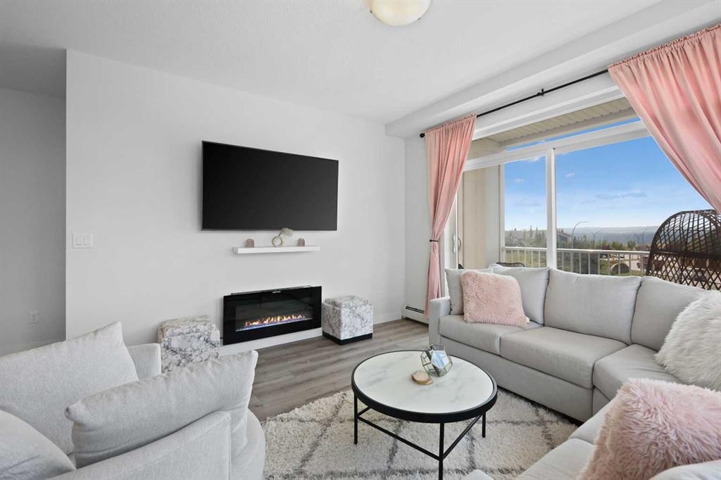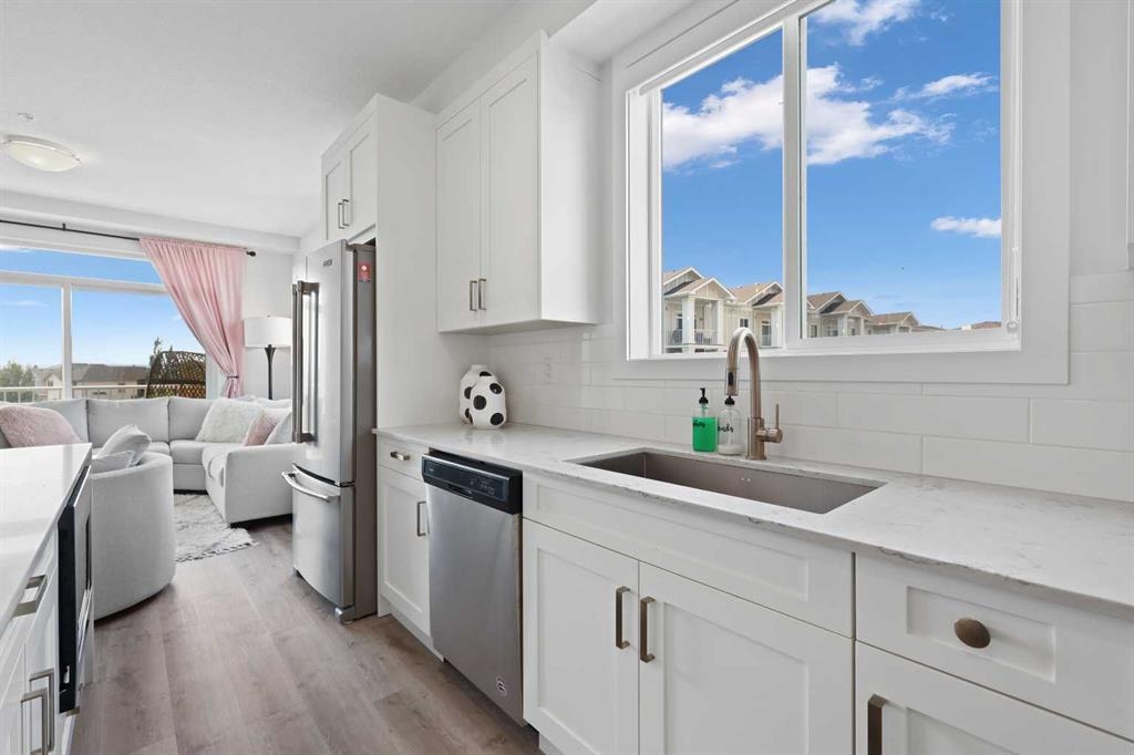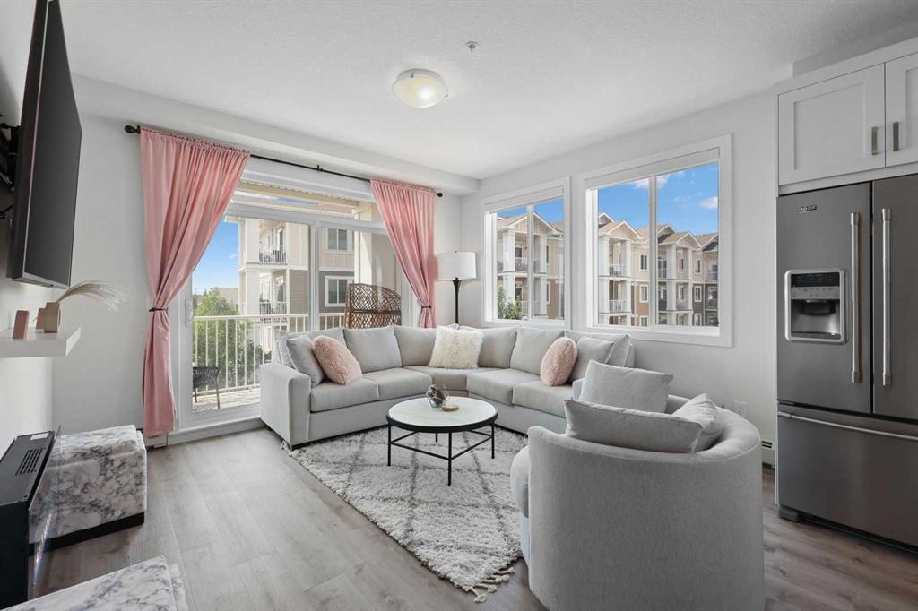Welcome to Cranston Ridge, where modern living meets convenience. This stunning third floor corner unit offers 2 bedrooms, 2 bathrooms and a contemporary design with many thoughtful upgrades! The kitchen boasts high-end stainless steel appliances, quartz countertops, extra large island with a stunning waterfall edge, beautiful cabinetry, a pantry, an impressive upgraded hoodfan and new light fixtures over the island. The spacious primary bedroom with blackout blinds, includes a large walk-through closet leading to a beautifully designed 4 piece ensuite with a fully tiled shower, double-sink vanity and additional storage. The second bedroom is bright and located next to the main bathroom. This room is perfectly suited for guests or for use as a home office. The open floor plan flows seamlessly into a generous living area, ideal for entertaining or relaxing in front of the TV (electric fireplace not included). Step outside to the sunny balcony, complete with a natural gas hookup for your BBQ. The corner location offers an abundance of windows and lots of natural light. Additional conveniences include a high-efficiency washer and dryer, a titled heated underground parking stall, and a storage locker conveniently located near your parking space. Cranston Ridge offers a well-maintained and desirable complex, located just minutes from shopping, hiking trails, playgrounds and schools. Enjoy easy access to the Bow River Valley and Fish Creek Park, with excellent connections to Seton, the South Calgary Health Campus, and major routes like Stoney and Deerfoot Trails. The community HOA fee includes access to the exclusive Century Hall, offering amenities such as a gymnasium, multipurpose rooms, an outdoor rink with a Zamboni, a pleasure pond, toboggan hill, splash park, playground, pickleball/tennis courts, and basketball. This apartment is perfect for anyone seeking an elegant, low-maintenance lifestyle while staying close to nature, playgrounds, and shopping, with quick access to Deerfoot Trail, Stoney Trail, Seton Lifestyle District, and the South Health Campus Hospital. This home is immaculate and ready for you to simply move in!